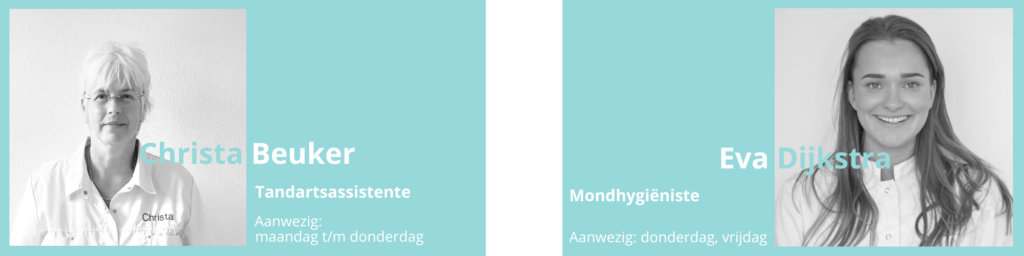 Ons team Arie Booij – Tandarts en eigenaar Arjan Höfte – ZZP Tandarts Christa Beuker Eva Dijkstra – Mondhygiëniste
